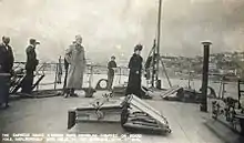 In May 1914, Maria Feodorovna travelled to England to visit her sister.[63] While she was in London, World War I broke out (July 1914), forcing her to hurry home to Russia. In Berlin the German authorities prevented her train from continuing toward the Russian border. Instead she had to return to Russia by way of (neutral) Denmark and Finland. Upon her return in August, she took up residence at Yelagin Palace, which was closer to St. Petersburg (renamed Petrograd in August 1914[64]) than Gatchina.[63] During the war she served as president of Russia's Red Cross.[65] As she had done a decade earlier in the Russo-Japanese War of 1904–1905, she also financed a sanitary train.[63]