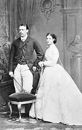 Alexander II of Russia and Maria Alexandrovna had grown fond of Dagmar, and they wanted her to marry their new heir, Tsarevich Alexander. In an affectionate letter, Alexander II told Dagmar that he hoped she would still consider herself a member of their family.[19] Maria Alexandrovna tried to convince Louise of Hesse-Kassel to send Dagmar to Russia immediately, but Louise insisted that Dagmar must "strengthen her nerves... [and] avoid emotional upsets."[20] Dagmar, who sincerely mourned Nicholas, and Alexander, who was in love with his mother's lady-in-waiting Mariya Meshcherskaya and attempted to renounce his place as heir to the throne in order to marry her, were both initially reluctant. However, under pressure from his parents, Alexander decided to go to Denmark.[21]