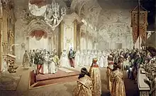 In the following weeks, Dagmar was educated in Russian court etiquette. She converted to Orthodoxy on 24 October [O.S. 12 October] 1866 and became Grand Duchess Maria Feodorovna of Russia the following day. However, at the Russian court, where French was practically the first language, she was often called "Marie". The lavish wedding took place on 9 November [O.S. 28 October] 1866 in the Imperial Chapel of the Winter Palace in Saint Petersburg. Financial constraints had prevented her parents from attending the wedding, and in their stead, they sent her brother, Crown Prince Frederick. Her brother-in-law, the Prince of Wales, had also travelled to Saint Petersburg for the ceremony; pregnancy had prevented the Princess of Wales from attending.[27] After the wedding night, Alexander wrote in his diary, "I took off my slippers and my silver embroidered robe and felt the body of my beloved next to mine... How I felt then, I do not wish to describe here. Afterwards we talked for a long time."[28]