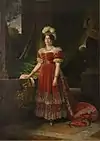 Meanwhile, the queen began to institute changes in court customs. Some of them met with the disapproval of the older generation, such as the abandonment of heavy make-up and the popular wide-hooped panniers.[62] The new fashion called for a simpler feminine look, typified first by the rustic robe à la polonaise style and later by the gaulle, a layered muslin dress Marie Antoinette wore in a 1783 Vigée-Le Brun portrait.[63] In 1780 she began to participate in amateur plays and musicals in the Théâtre de la Reine built for her by Richard Mique.[64]