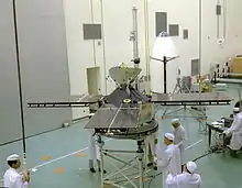 Mariner 4 (together with Mariner 3 known as Mariner-Mars 1964) was the fourth in a series of spacecraft intended for planetary exploration in a flyby mode. It was designed to conduct closeup scientific observations of Mars and to transmit these observations to Earth. Launched on November 28, 1964,[3] Mariner 4 performed the first successful flyby of the planet Mars, returning the first close-up pictures of the Martian surface. It captured the first images of another planet ever returned from deep space; their depiction of a cratered, dead planet largely changed the scientific community's view of life on Mars.[4][5] Other mission objectives were to perform field and particle measurements in interplanetary space in the vicinity of Mars and to provide experience in and knowledge of the engineering capabilities for interplanetary flights of long duration. Initially expected to remain in space for eight months, Mariner 4's mission lasted about three years in solar orbit.[6] On December 21, 1967, communications with Mariner 4 were terminated.