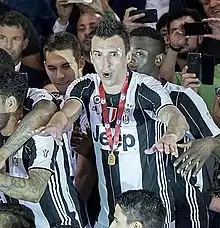 Mandžukić's second season with Juventus was particularly notable, as he was often played out of position by the club's manager Massimiliano Allegri; throughout the 2016–17 season, he primarily served as a left winger, rather than as an out and out striker, a position which he normally occupied in the past. Although his goalscoring rate decreased, he drew praise in the media for his work-rate, versatility, consistency, and for the overall high quality of his performances in this new role.[46] On 25 May 2017, Mandžukić signed a contract extension that would keep him at the club until 2020.[47] On 3 June, Mandžukić started in the Champions League Final. He scored the equalising goal in the 27th minute, just seven minutes after Cristiano Ronaldo's goal gave Real Madrid the lead. Mandžukić chested down a ball from Gonzalo Higuaín and hooked the ball over his shoulder from 15 yards (14 m),[48] which arced over Keylor Navas in net. The goal was heralded as one of the best goals ever scored in a Champions League final, and was compared to Zinedine Zidane's goal in the 2002 final for Real Madrid;[49] but Juventus were ultimately defeated 4–1.[50] Mandžukić's bicycle kick goal against Real Madrid went on to win the 2016–17 UEFA Goal of the Season award.[51]