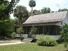 In 1928, with a small inheritance from her mother, the Rawlingses purchased a 72-acre (290,000 m2) orange grove near Hawthorne, Florida, in a settlement named Cross Creek for its location between Orange Lake and Lochloosa Lake. She brought the place to international fame through her writing. She was fascinated with the remote wilderness and the lives of Cross Creek residents, her Florida cracker neighbors, and felt a profound and transforming connection to the region and the land.[7][8] Wary at first, the local residents soon warmed to her and opened up their lives and experiences to her. Marjorie actually made many visits to meet with Calvin and Mary Long to observe their family relationships.[9] This relationship ended up being used as a model for the family in her most successful novel, The Yearling.[9] The Longs lived in a clearing named Pat's Island, but Marjorie renamed the clearing "Baxter's Island."[9] Marjorie filled several notebooks with descriptions of the animals, plants, Southern dialect, and recipes and used these descriptions in her writings.[10]