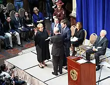 Dayton took the oath of office to become Governor of Minnesota on January 3, 2011. Taking office a few weeks before his 64th birthday, Dayton was the oldest person ever inaugurated as governor in Minnesota history.[38] Former Vice President and Senator Walter Mondale served as Master of Ceremony at the inauguration. The first DFLer to serve as governor in 20 years, Dayton succeeded Republican Governor Tim Pawlenty. On January 5, Governor Dayton signed two Executive Orders allowing the Minnesota Departments of Commerce and Health to apply for federal health-care grants, and provide $1.2 billion in federal funds toward an Early Option for a statewide Medicaid Opt-In program. These Executive Orders reversed the previous administration's ban on federal funding for the state's health-care system.[39] In March 2011, Dayton signed a law increasing penalties on those who injure or kill police dogs.[40]