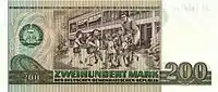 ![]() 200 Mark der DDR note, 1985 (front) ![]() M 200 note, 1985 (back) ![]() 500 Mark der DDR note, 1985 (front) ![]() M 500 note, 1985 (back) |