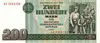 The Staatsbank der DDR (State Bank of the GDR) had planned to issue M 200 and M 500 notes. The notes were printed in 1971 and in 1984 in preparation for issue, but were never circulated. A few examples are held by collectors. Unlike the lower-denomination notes, these notes did not have a personality on the obverse. The M200 note had on its front a family with two children in front of a modern GDR high-rise apartment building. The back pictured a schoolyard with eight children and a teacher. The watermark was a dove of peace. On the M500 note, the front showed the coat-of-arms of the GDR (hammer and a compass in a wreath), while the back showed the State Council (Staatsrat) building of the GDR in Berlin. |