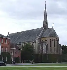The main focus of the college is the Court. This is surrounded by buildings in a number of different styles. At the south end is the back of an early 18th-century mansion, later converted to a coaching inn which was bought as the first building for the school.[12] The main block of what now forms C House, it was built by Charles Seymour, 6th Duke of Somerset and is a Grade I listed building.[13] Next to it are the old stables, now converted into boarding houses. The west side consists of the 1959 red brick dining hall, and a Victorian boarding house now converted to other purposes. The north west corner is dominated by its Victorian Gothic style chapel by the architects George Frederick Bodley and Thomas Garner which has a collection of pre-Raphaelite style paintings by John Roddam Spencer Stanhope and stained glass by Old Marlburian William Morris.