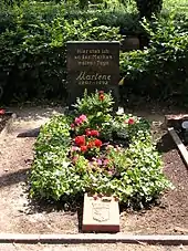In her will Dietrich expressed the wish to be buried in her birthplace Berlin, near her family. Her body was flown there to fulfill her wish on 16 May 1992.[87] Her coffin was draped in an American flag befitting her status as an American. As her coffin traveled through Berlin bystanders threw flowers onto it, a fitting tribute because Dietrich loved flowers, even saving the flowers thrown to her at the end of her performances for use in subsequent shows. Dietrich was interred at the Städtischer Friedhof III, Schöneberg, close by the grave of her mother Josefine von Losch, and near the house where she was born.[84]