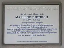 Dietrich was made an honorary citizen of Berlin on 16 May 2002. Translated from German, her memorial plaque reads