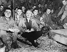 During two extended tours for the USO in 1944 and 1945,[40] she performed for Allied troops in Algeria, Italy, the UK, France and Heerlen in the Netherlands,[42] then entered Germany with Generals James M. Gavin and George S. Patton. When asked why she had done this, in spite of the obvious danger of being within a few kilometers of German lines, she replied, "aus Anstand"—"out of decency".[43] Wilder later remarked that she was at the front lines more than Dwight Eisenhower. Her revue, with Danny Thomas as her opening act for the first tour, included songs from her films, performances on her musical saw (a skill taught to her by Igo Sym that she had originally acquired for stage appearances in Berlin in the 1920s) and a "mindreading" act that her friend Orson Welles had taught her for his Mercury Wonder Show. Dietrich would inform the audience that she could read minds and ask them to concentrate on whatever came into their minds. Then she would walk over to a soldier and earnestly tell him, "Oh, think of something else. I can't possibly talk about that!" American church papers reportedly published stories complaining about this part of Dietrich's act. [36][40]