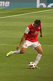 On 21 May 2010, Chamakh completed his move to Arsenal on a free transfer after completing his contract with Bordeaux.[44][45] The transfer took effect on 1 July 2010.[46] He made his debut in a pre-season friendly against Barnet on 17 July, appearing as a substitute.[47] On 27 July, he scored his first pre-season goal for the club, converting a penalty in a 4–0 victory over Austrian club SC Neusiedl.[48] In the 2010 edition of the Emirates Cup, Chamakh scored on his home debut against Italian club Milan.[49] On 7 August 2010, he scored the first goal in 6-5 win against Legia Warsaw in a friendly match and the last match for pre-season.[50] He made his Premier League debut on 15 August in the team's 1–1 draw with Liverpool. Chamakh contributed to the team's equalising goal by heading a cross off the goal post, which then redirected off goalkeeper Pepe Reina and into the back of the net, resulting in an own goal.