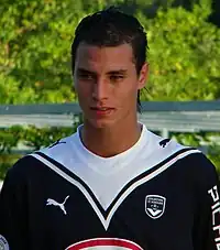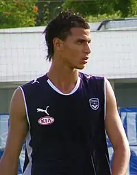 Following the season, Chamakh turned professional and signed a three-year contract with Bordeaux. He spent the first half of the 2002–03 campaign playing in the fourth division, but following the winter break, was called up to the senior team by manager Élie Baup. Chamakh made his professional debut on 19 January 2003 in the team's Coupe de la Ligue match against Metz. He appeared as a substitute and played 15 minutes in a 1–0 defeat.[13] Chamakh made his league debut three weeks later in a 2–0 home defeat to Bastia again appearing as a substitute.[14] On 20 May, he scored his first professional goal against Nice, netting the equalizing goal just a minute before injury time in a 1–1 draw.[15] Chamakh appeared in 14 games, always as a substitute, during the campaign. In the 2003–04 season, he was promoted to the senior team permanently by new manager Michel Pavon and made his first professional league start on 1 November 2003 in a 1–0 win over Marseille.[16] In the team's following match, Chamakh scored the opening goal in a 1–1 draw with Strasbourg just before halftime. However, midway through the second half, he received his first career red card after incurring a second yellow.[17] Upon returning from his one-game suspension, Chamakh developed into a regular starter for the club, scoring goals in consecutive matches against Metz and Montpellier.[18][19] He finished the league campaign with six goals in 25 matches. In the club's UEFA Cup campaign, Chamakh netted four times in eight appearances.