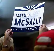 McSally won the August 28 Republican primary with 53 percent of the vote and faced Democratic nominee Kyrsten Sinema in the November general election.[52] The general election remained undecided for several days after election night until all ballots were counted in the close contest.[53] McSally held a lead by the end of election night, but it narrowed over the next few days as more ballots were counted.[53] During this time, both McSally and Sinema voiced support for counting all the ballots.[53] There was no evidence of any fraud.[54] On November 12, McSally conceded to Sinema, congratulating her on becoming Arizona's first female Senator. Sinema won by almost 56,000 votes.[55][56] In May 2021 former deputy campaign manager Anthony Barry pleaded guilty to the theft of $115,000 campaign funds from the McSally campaign.[57]