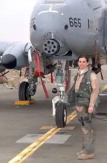 McSally then completed Replacement Training Unit for the A-10 Thunderbolt II at Davis–Monthan Air Force Base and was assigned to an operational A-10 squadron that deployed to Kuwait in January 1995.[12][13] During this deployment, she flew combat patrol over Iraq in support of Operation Southern Watch, enforcing the no-fly zone over southern Iraq and becoming "the first female U.S. fighter pilot to fly in combat and the first woman to command a fighter squadron."[12][14]