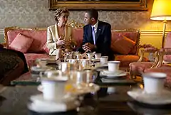 McAleese used her time in office to address issues concerning justice, social equality, social inclusion, anti-sectarianism and reconciliation. She described her presidency's theme as "Building Bridges".[9] This bridge-building materialised in her attempts to reach out to the unionist community in Northern Ireland. These steps included celebrating the Twelfth of July at Áras an Uachtaráin and taking Communion in a Church of Ireland cathedral in Dublin, for which she incurred some criticism from some of the Irish Catholic hierarchy.[10] Though a Catholic, McAleese holds liberal views on homosexuality and women priests.[11] She is a member of the Council of Women World Leaders and was ranked the 64th most powerful woman in the world by Forbes.[12] In spite of some minor controversies,[13] McAleese remained popular, and her presidency is regarded as successful.[14][15][16]