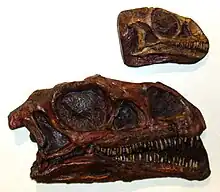 Massospondylus remains have been found in the Upper Elliot Formation, the Clarens Formation, and the Bushveld Sandstone of South Africa and Lesotho, as well as the Forest Sandstone of Zimbabwe. These remains consist of at least 80 partial skeletons and four skulls, representing both juveniles and adults.[6] The report of Massospondylus from Arizona's Kayenta Formation is based on a skull described in 1985. The skull of the Kayenta specimen from Arizona is 25% larger than the largest skull from any African specimen.[7] The Kayenta specimen possesses four teeth in the premaxilla and sixteen in the maxilla. Uniquely among dinosaurs, it also had tiny, one-millimetre-(0.04 in-) long palatal teeth.[8] A 2004 restudy of African Massospondylus skulls, however, indicated that the Kayenta specimen did not pertain to Massospondylus.[9] This Kayenta skull and associated postcranial elements, identified collectively as MCZ 8893, was referred to the new genus Sarahsaurus in 2010.[10]