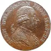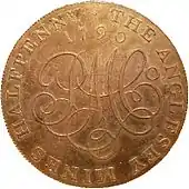 The national financial crisis reached its nadir in February 1797, when the Bank of England stopped redeeming its bills for gold. In an effort to get more money into circulation, the Government adopted a plan to issue large quantities of copper coins, and Lord Hawkesbury summoned Boulton to London on 3 March 1797, informing him of the Government's plan. Four days later, Boulton attended a meeting of the Privy Council, and was awarded a contract at the end of the month.[79] According to a proclamation dated 26 July 1797, King George III was "graciously pleased to give directions that measures might be taken for an immediate supply of such copper coinage as might be best adapted to the payment of the laborious poor in the present exigency ... which should go and pass for one penny and two pennies".[80] The proclamation required that the coins weigh one and two ounces respectively, bringing the intrinsic value of the coins close to their face value.[80] Boulton made efforts to frustrate counterfeiters. Designed by Heinrich Küchler, the coins featured a raised rim with incuse or sunken letters and numbers, features difficult for counterfeiters to match.[71] The twopenny coins measured exactly an inch and a half across; 16 pennies lined up would reach two feet.[71] The exact measurements and weights made it easy to detect lightweight counterfeits. Küchler also designed proportionate halfpennies and farthings; these were not authorised by the proclamation, and though pattern pieces were struck, they never officially entered circulation. The halfpenny measured ten to a foot, the farthing 12 to a foot.[71] The coins were nicknamed "cartwheels", both because of the size of the twopenny coin and in reference to the broad rims of both denominations.[81] The penny was the first of its denomination to be struck in copper.[82] The new coins were issued at the Soho Mint and by Charlotte Matthews who was the banker and business advisor to Watt and Boulton.[83]