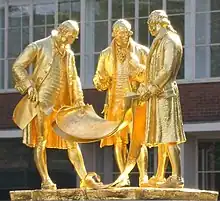 Boulton is recognised by several memorials and other commemorations in and around Birmingham. Soho House, his home from 1766 until his death, is now a museum,[119] as is his first workshop, Sarehole Mill.[120] Matthew Boulton's family papers, along with the records of James Watt and family and the firm of Boulton and Watt collectively form the Archives of Soho and are held at Birmingham Archives and Collections,[42] at the Library of Birmingham. He is recognised by blue plaques at his Steelhouse Lane birthplace and at Soho House.[121] A gilded bronze statue of Boulton, Watt and Murdoch (1956) by William Bloye stands opposite Centenary Square in central Birmingham.[122] Matthew Boulton College was named in his honour in 1957.[123] The two-hundredth anniversary of his death, in 2009, resulted in a number of tributes. Birmingham City Council promoted "a year long festival celebrating the life, work and legacy of Matthew Boulton".[124]