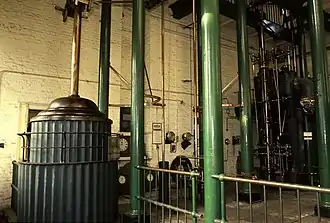 The pumping engine for use in mines was a great success. In 1782 the firm sought to modify Watt's invention so that the engine had a rotary motion, making it suitable for use in mills and factories. On a 1781 visit to Wales Boulton had seen a powerful copper-rolling mill driven by water, and when told it was often inoperable in the summer due to drought suggested that a steam engine would remedy that defect. Boulton wrote to Watt urging the modification of the engine, warning that they were reaching the limits of the pumping engine market: "There is no other Cornwall to be found, and the most likely line for increasing the consumption of our engines is the application of them to mills, which is certainly an extensive field."[60] Watt spent much of 1782 on the modification project, and though he was concerned that few orders would result, completed it at the end of the year.[61] One order was received in 1782, and several others from mills and breweries soon after.[62] George III toured the Whitbread brewery in London, and was impressed by the engine there[63] (now preserved at the Powerhouse Museum, Sydney, Australia[64]). As a demonstration, Boulton used two engines to grind wheat at the rate of 150 bushels per hour in his new Albion Mill in London.[63] While the mill was not financially successful,[65] according to historian Jenny Uglow it served as a "publicity stunt par excellence" for the firm's latest innovation.[63] Before its 1791 destruction by fire, the mill's fame, according to early historian Samuel Smiles, "spread far and wide", and orders for rotative engines poured in not only from Britain but from the United States and the West Indies.[66]
