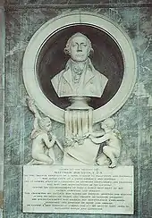 By early 1809 he was seriously ill.[110] He had long suffered from kidney stones, which also lodged in the bladder, causing him great pain.[117] He died at Soho House on 17 August 1809.[110] He was buried in the graveyard of St. Mary's Church, Handsworth, in Birmingham – the church was later extended over the site of his grave. Inside the church, on the north wall of the sanctuary, is a large marble monument to him, commissioned by his son, sculpted by the sculptor John Flaxman.[118] It includes a marble bust of Boulton, set in a circular opening above two putti, one holding an engraving of the Soho Manufactory.[118]