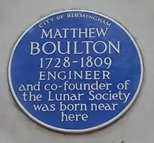 The elder Boulton's business prospered after young Matthew's birth, and the family moved to the Snow Hill area of Birmingham, then a well-to-do neighbourhood of new houses. As the local grammar school was in disrepair Boulton was sent to an academy in Deritend, on the other side of Birmingham.[7] At the age of 15 he left school, and by 17 he had invented a technique for inlaying enamels in buckles that proved so popular that the buckles were exported to France, then reimported to Britain and billed as the latest French developments.[8]