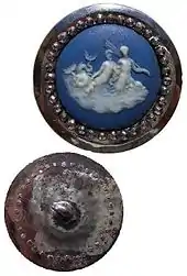 Among Boulton's most successful products were mounts for small Wedgwood products such as plaques, cameo brooches and buttons in the distinctive ceramics, notably jasper ware, for which Wedgwood's firm remains well known. The mounts of these articles, many of which have survived, were made of ormolu or cut steel, which had a jewel-like gleam.[41] Boulton and Wedgwood were friends, alternately co-operating and competing, and Wedgwood wrote of Boulton, "It doubles my courage to have the first Manufacturer in England to encounter with—The match likes me well—I like the Man, I like his spirit."[41]