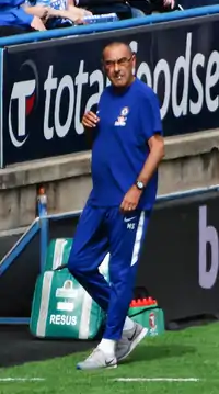 On 14 July 2018, Sarri was appointed head coach of Chelsea, replacing Antonio Conte who was sacked the day before.[40] In his first competitive game on 5 August, the team lost the Community Shield 2–0 to Manchester City at Wembley Stadium.[41] The following week, he recorded his first win as Chelsea manager in a 3–0 league win away to Huddersfield Town.[42] Sarri became the first head coach or manager to remain undefeated throughout his first 12 Premier League fixtures,[43] until 24 November, where they lost 3–1 to Tottenham Hotspur.[44][45]