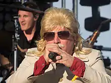 In live performances with Tool, Keenan has often been situated on a platform towards the rear of the stage,[81] without a spotlight,[82] facing the backdrop rather than the audience.[83][84] Breckinridge Haggerty, the band's live video director, says that the dark spaces on stage "are mostly for Maynard". He explains, "a lot of the songs are a personal journey for him and he has a hard time with the glare of the lights when he's trying to reproduce these emotions for the audience. He needs a bit of personal space, and he feels more comfortable in the shadows."[85] An exception, which surprised even devout Tool fans, occurred when a fan climbed on stage and attempted to hug Keenan during the band's performance of "Pushit". After dropping the fan to the ground with a gentle hip toss, Keenan, continuing to sing, wrapped himself around the man's back into a rear naked choke. He held the man without actually constricting his neck, allowing him to raise his fist in celebration. Keenan eventually turned the man to his stomach and sat on his back, where he stayed for "an uncomfortably long period of time."[86] His appearance with Tool has included the Mohawk hairstyle,[82] wigs, Kabuki masks, bras, tights,[87] and his entire body in blue paint.[88][89] This is contrasted with a variety of long haired wigs while performing with or promoting A Perfect Circle.[90][91]
