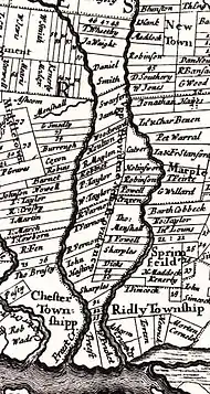 In 1683, the Court of Chester County approved the construction of "Providence Great Road" (now Pennsylvania Route 252). The road, which runs north from Chester to within a few blocks of today's downtown, is shown on a 1687 map along with the names of local landowners.[10] It forms the eastern border of the borough.