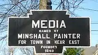 Streets were plotted in a rectangular grid around the location of the new courthouse, lots were sold at public auctions, and the construction of houses began. Sources agree that Minshall Painter, a descendant of Thomas Minshall, suggested the name "Media", but do not agree on the reason. The name most likely comes from the borough's "median" location in the direct center of Delaware County.[14] In 1940, the Pennsylvania guide described Media by noting that "[t]he majority of its houses, almost all built since the Civil War, sit far back on shaded lawns and seem somewhat gloomy. The borough has a large and prosperous business section and a few small industrial plants; many townspeople work in Philadelphia or Chester."[15]