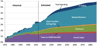 In 2022, Medicare spending was over $900 billion, near 4% of U.S. gross domestic product according to the Trustees Figure 1.1 and over 15% of total US federal spending.[24] Because of the two Trust funds and their differing revenue sources (one dedicated and one not), the Trustees analyze Medicare spending as a percent of GDP rather than versus the Federal budget.