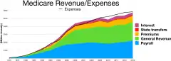 In 2022, according to the 2023 Medicare Trustees Report, Medicare provided health insurance for 65.0 million individuals—more than 57 million people aged 65 and older and about 8 million younger people.[1] According to annual Medicare Trustees reports and research by Congress' MedPAC group, Medicare covers about half of healthcare expenses of those enrolled. Enrollees almost always cover most of the remaining costs by taking additional private insurance and/or by joining a public Medicare Part C and/or Medicare Part D health plan. In 2022, spending by the Medicare Trustees topped $900 billion per the Trustees report Table II.B.1, of which $423 billion came from the U.S. Treasury and the rest primarily from the Part A Trust Fund (which is funded by payroll taxes) and premiums paid by beneficiaries. Households that retired in 2013 paid only 13 to 41 percent of the benefit dollars they are expected to receive.[2][3]