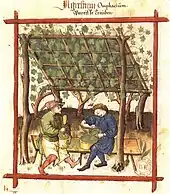 Many basic variations of cooking utensils available today, such as frying pans, pots, kettles, and waffle irons, already existed, although they were often too expensive for poorer households. Other tools more specific to cooking over an open fire were spits of various sizes, and material for skewering anything from delicate quails to whole oxen.[44] There were also cranes with adjustable hooks so that pots and cauldrons could easily be swung away from the fire to keep them from burning or boiling over. Utensils were often held directly over the fire or placed into embers on tripods. To assist the cook there were also assorted knives, stirring spoons, ladles and graters. In wealthy households one of the most common tools was the mortar and sieve cloth, since many medieval recipes called for food to be finely chopped, mashed, strained and seasoned either before or after cooking. This was based on a belief among physicians that the finer the consistency of food, the more effectively the body would absorb the nourishment. It also gave skilled cooks the opportunity to elaborately shape the results. Fine-textured food was also associated with wealth; for example, finely milled flour was expensive, while the bread of commoners was typically brown and coarse. A typical procedure was farcing (from the Latin farcio 'to cram'), to skin and dress an animal, grind up the meat and mix it with spices and other ingredients and then return it into its own skin, or mold it into the shape of a completely different animal.[45]