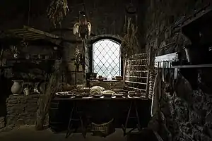 The kitchen staff of huge noble or royal courts occasionally numbered in the hundreds: pantlers, bakers, waferers, sauciers, larderers, butchers, carvers, page boys, milkmaids, butlers, and numerous scullions. While an average peasant household often made do with firewood collected from the surrounding woodlands, the major kitchens of households had to cope with the logistics of daily providing at least two meals for several hundred people. Guidelines on how to prepare for a two-day banquet can be found in the cookbook Du fait de cuisine ('On cookery') written in 1420 in part to compete with the court of Burgundy[46] by Maistre Chiquart, master chef of Duke Amadeus VIII of Savoy.[47] Chiquart recommends that the chief cook should have at hand at least 1,000 cartloads of "good, dry firewood" and a large barnful of coal.[48]