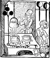 Urban cookshops that catered to workers or the destitute were regarded as unsavory and disreputable places by the well-to-do and professional cooks tended to have a bad reputation. Geoffrey Chaucer's Hodge of Ware, the London cook from the Canterbury Tales, is described as a sleazy purveyor of unpalatable food. French cardinal Jacques de Vitry's sermons from the early 13th century describe sellers of cooked meat as an outright health hazard.[51] While the necessity of the cook's services was occasionally recognized and appreciated, they were often disparaged since they catered to the baser of bodily human needs rather than spiritual betterment. The stereotypical cook in art and literature was male, hot-tempered, prone to drunkenness, and often depicted guarding his stewpot from being pilfered by both humans and animals. In the early 15th century, the English monk John Lydgate articulated the beliefs of many of his contemporaries by proclaiming that "Hoot ffir [fire] and smoke makith many an angry cook."[52]