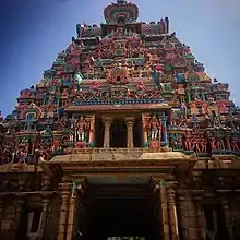 Madurai Meenakshi Sundareswarar temple was built by Pandayan Emperor Sadayavarman Kulasekaran I (1190 CE–1205 CE). He built the main Portions of the three-storeyed Gopuram at the entrance of Sundareswarar Shrine and the central portion of the Goddess Meenakshi Shrine are some of the earliest surviving parts of the temple. The traditional texts call him a poet-saint king, additionally credit him with a poem called Ambikai Malai, as well as shrines (koil) each for Natarajar and Surya near the main temple, Ayyanar in the east, Vinayagar in the south, Kariamalperumal in the west and Kali in the north. He also built a Mahamandapam. Kulasekara Pandya was also a poet and he composed a poem on Meenakshi named Ambikai Malai.[9] Maravarman Sundara Pandyan I built a gopuram in 1231, then called Avanivendaraman, later rebuilt, expanded and named as Sundara Pandya Thirukkopuram.[9] Chitra gopuram (W), also known as Muttalakkum Vayil, was built by Maravarman Sundara Pandyan II (1238-1251). This gopuram is named after the frescoes and reliefs that depict secular and religious themes of Hindu culture. Maravarman Sundara Pandyan II also added a pillared corridor to the Sundareswara shrine and the Sundara Pandyan Mandapam.[9] It was rebuilt after the 14th-century damage, its granite structure was renovated by Kumara Krishnappar after 1595.[10]