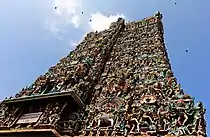 The temple complex has 4 nine-storey gopurams (outer, raja), 1 seven-storey gopuram (Chittirai), 5 five-storey gopurams, 2 three-storey, and 2 one-storey gold-gilded sanctum towers.[70] Of these five are gateways to the Sundareshvara shrine, three to the Meenakshi shrine. The towers are covered with stucco images, some of whom are deity figures and others are figures from Hindu mythology, saints or scholars. Each group or sets of panels in each storey present an episode from regional or pan-Hindu legend. The four tallest gopurams on the outer walls alone depict nearly 4,000 mythological stories.[70][41]
