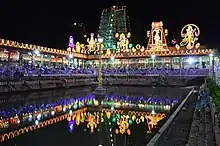 The temple is a major pilgrimage destination within the Shaivism tradition, dedicated to Meenakshi Devi and Shiva. However, the temple includes Vishnu in many narratives, sculptures and rituals as he is considered to be Meenakshi's brother.[19] This has made this temple and Madurai as the "southern Mathura", one included in Vaishnava texts.[20][21] The Meenakshi temple also includes Lakshmi, flute playing Krishna, Rukmini, Brahma, Saraswati, and other Vedic and Puranic deities, as well as artwork showing narratives from major Hindu texts. The large temple complex is the most prominent landmark in Madurai and attracts tens of thousands of visitors a day.[22] The temple attracts over a million pilgrims and visitors during the annual 10-day Meenakshi Tirukalyanam festival, celebrated with much festivities and a ratha (chariot) procession during the Tamil month of Chittirai (overlaps with April–May in the Georgian calendar, Chaitra in North India).[23] The Temple has been adjudged the best 'Swachh Iconic Place' in India as on 1 October 2017 under Swachh Bharat Abhiyan.[24]