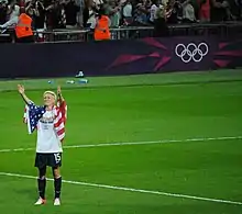 Rapinoe is internationally known for her crafty style of play and her activism off the pitch.[7][8][9] Her precise cross to Abby Wambach in the 122nd minute of the 2011 FIFA Women's World Cup quarterfinal match against Brazil resulted in an equalizer and eventual win for the Americans after a penalty shootout. The last-minute goal received ESPN's 2011 ESPY Award for Best Play of the Year. During the 2012 London Olympics, she scored three goals and tallied a team-high four assists to lead the United States to a gold medal. She is the first player, male or female, to score a goal directly from a corner at the Olympic Games, having done so twice. She won the Golden Boot and Golden Ball awards at the 2019 FIFA Women's World Cup in France.[10]