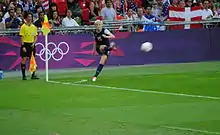 During a dramatic semi-final match against Canada at Old Trafford, Rapinoe scored two game-equalizing goals in the 54th and 70th minutes. Her first goal was scored directly from a corner — a corner kick that goes untouched by another player into the net.[113][114] She is the first and so far only player, male or female, to score an Olimpico at the Olympic Games.[115] The U.S. defeated Canada 4–3 with a stoppage time goal in the 123rd minute by Alex Morgan.[116] With her two goals, Rapinoe is one of only five players, including Wei Haiying, Cristiane, Angela Hucles and Christine Sinclair, to have scored two goals during an Olympic semi-final.[117]