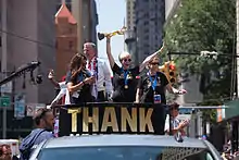 Rapinoe was named to the United States' 2019 FIFA Women's World Cup roster in May 2019; it was her third World Cup appearance.[133] In a 13–0 win over Thailand during the group stage of the tournament, she contributed a goal.[134] The United States advanced to the knockout stage, where they faced Spain. Rapinoe scored twice in a 2–1 victory that sent the U.S. to a quarterfinal matchup against the host country, France. In the fifth minute, Rapinoe scored on a free kick to give the United States an early lead. She later added a second goal, and the U.S. held on to earn a semi-final berth. Rapinoe was named Player of the Match by FIFA for her performances in the round of 16 and quarterfinals.[135]