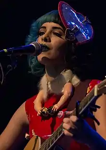 At age sixteen, after watching 101 Dalmatians, Martinez dyed half of her hair blonde, in the same vein as Cruella de Vil.[74][98] She became known for the look,[99] as well as her "baby doll"-inspired outfits in music videos and when performing.[100] The Guardian has called her image "doll-like and decidedly emo [...] hyperreal" while her music is best known to be "part-nursery rhyme, part tragic life story".[79]