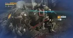The game's cutting system allows players to engage in melee combat, as well as to precisely slash enemies and objects at will along a geometrical plane using the "free slicing" Blade Mode. Virtually any object in the game can be cut, including vehicles and enemies, though elements of the environment were intentionally limited to structures such as pillars and walls to better facilitate the game.[4] Entering Blade Mode produces a special targeting reticule in the form of a transparent blue plane which can be rotated and moved, tracing orange lines across the surfaces of objects to indicate exactly where they will be cut; it can also be used to enter a bullet time state, giving players the opportunity to precisely slash targets during moments of action, such as slicing through a falling target from multiple angles before it hits the ground. These features can be employed strategically, for example disabling opponents, finding weak points and gaps in armor, severing support columns to collapse ceilings or walls onto enemies, deflecting enemy fire, or cutting through objects to remove enemy cover.[5][6] However, entering into Blade Mode reduces Raiden's energy to the point that if dropped to a certain level, it cannot be used.[7] Throughout the story the player obtains the Ripper Mode, a state which enhances Raiden's power for a limited time facilitating the use of Blade Mode.[8]