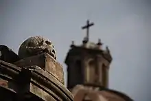 In 1752, on 17 September, a cross of iron, with more than three varas, with its vane, was placed on the crown of the lantern tower of this church, engraved on one side and on the other side the prayer of the Sanctus Deus, and in the middle of it a fourth-by-fourth oval, in which a wax of Agnus was placed on one side with its window and on the other side a sheet in which Saint Prisca, lawyer of the rays, was sculpted. The ear of the cross is of two varas, and all its weight is of fourteen arrobas; it is nailed to a quarry base.[24]
