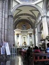 The interiors of each wing have separate uses. In the west wing is the baptistry, in the north is the main altar, the main entrance and a notary area, separated by inside corner walls made of chiluca stone and tezontle. Chiluca, a white stone, covers the walls and floors and the tezontle frames the doors and windows. At the crossing of the structure is an octagonal dome framed by arches that form curved triangles where they meet at the top of the dome.[30] The principal altar is in the ornate Churrigueresque style and crafted by indigenous artist Pedro Patiño Ixtolinque. It was inaugurated in 1829.[13]