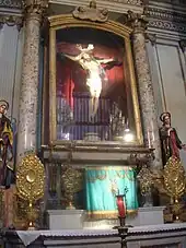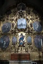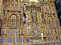 Additional sculptures were created by Sebastián de Santiago.[34] It takes its name from the statues of saintly royalty which form part of its decoration,[3] and is the oldest work in churrigueresque style in Mexico, taking 19 years to complete. At the bottom, from left to right, are six female royal saints: Saint Margaret of Scotland, Helena of Constantinople, Elisabeth of Hungary, Elizabeth of Aragon, Empress Cunegunda and Edith of Wilton.[35] In the middle of the altar are six canonized kings: Hermenegild, a Visigoth martyr; Henry II, Holy Roman Emperor; Edward the Confessor; and Casimir of Poland below, and Saints Louis of France and Ferdinand III of Castile above them. In between these kings an oil painting of the Adoration of the Magi by Juan Rodriguez Juarez shows Jesus as the King of kings. The top portion features a painting of the Assumption of Mary as celestial queen flanked by oval bas reliefs, one of Saint Joseph carrying the infant Jesus and the other of Saint Teresa of Ávila with a quill in her hand and the Holy Spirit above her, inspiring her to write.[36] In the upper part above this, there are angels carrying the attributes of the Virgin Mary such as the Sealed Fountain, the House of Gold, the Well of Living Water, and the Tower of David, and at the top is an image of God, the Father.[31]