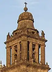The statues in the west tower are the work of José Zacarías Cora and represent Pope Gregory VII, Saint Augustine, Leander of Seville, St. Fulgentius of Écija, St.Francis Xavier, and Saint Barbara. The statues in the east tower are by Santiago Cristóbal Sandoval and depict Emilio, Rose of Lima, Mary (mother of Jesus), Ambrogio, Jerome, Philip of Jesus, Hippolytus of Rome, and Isidore the Laborer.[13]