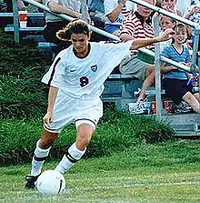 During the league's inaugural match between the Freedom and Bay Area CyberRays at RFK Stadium in Washington, D.C., Hamm was fouled in the penalty area resulting in a penalty kick that her teammate Pretinha converted to mark the first goal scored in the league. The Freedom won 1–0.[25] In addition to the 34,148 fans in attendance being greater than any MLS game that weekend, the Turner Network Television (TNT) broadcast reached 393,087 households: more than two MLS games broadcast on ESPN and ESPN2.[26] Playing as a midfielder and forward, Hamm played in 19 of the Freedom's 21 matches during the 2001 season.[27] She led the team in goals (6) and assists (4).[27] The Freedom finished in seventh place during the regular season with a 6–12–3 record.[27]