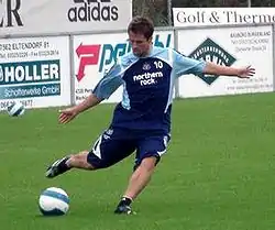 Owen returned to action after almost five months of layoff during the 1999–2000 season.[20] He played intermittently throughout the season and ended up ceding the Golden Boot to Kevin Phillips.[30] He had completed only six full games by January and, during a frustrating spell punctuated by recurring breakdowns,[30] had managed to stay the 90 minutes only three times since mid-October. Owen injured his hamstring once again while playing against Middlesbrough in January. He remained out of action for well over a month and later received treatment from German doctor Hans-Wilhelm Müller-Wohlfahrt.[31] The persistent hamstring problems ended up robbing Liverpool of Owen for a third of a season in which a lack of goals eventually cost them a place in the Champions League.[31]