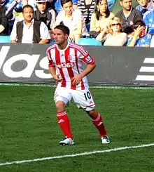 On 4 September 2012, Owen joined Stoke City on a one-year contract.[127] He was handed the number 10 shirt from the departed Ricardo Fuller and made his debut in a 1–1 draw against Manchester City on 15 September.[128] The start to his time at Stoke was hampered by a hamstring injury.[129] Owen scored his first and only goal for Stoke on 19 January 2013 in a 3–1 defeat at Swansea City, his first goal since 25 October 2011. In doing so, he became only the seventh player to reach 150 Premier League goals.[130]